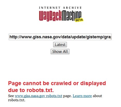 Here is what www.giss.nasa.gov robots.txt looks like. Hansen is blocking the web archive from searching GISS data, selected meetings and his publications.
